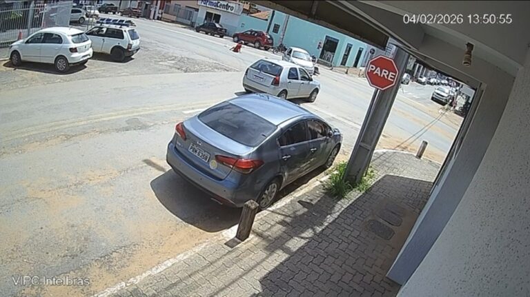 Imagens de câmera de monitoramento mostram o momento do impacto. Com a força da colisão, o passageiro da motocicleta, que estava com a camisa vermelha, chegou a ser arremessado, o que chamou a atenção de quem passava pelo local.