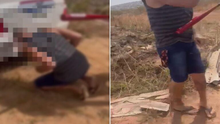Em outro trecho do vídeo, o homem aparece ajoelhado atrás de um carro branco e apanhando. Ele reclama de dores e, em meio a violência, o agressor o chuta e diz:
