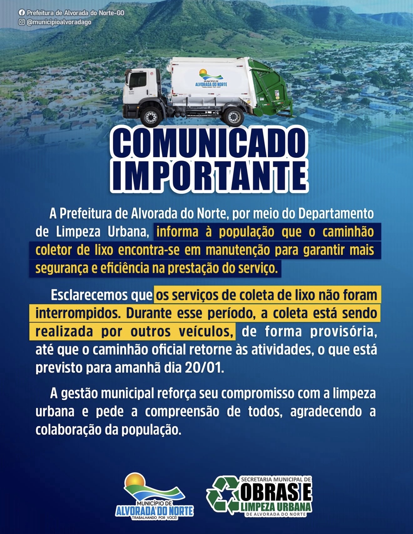 Diante das reclamações, a Prefeitura de Alvorada do Norte divulgou uma nota informando que o caminhão coletor de lixo do município encontra-se em manutenção. Segundo o comunicado, o serviço passa por ajustes para garantir mais segurança e eficiência na prestação do serviço.