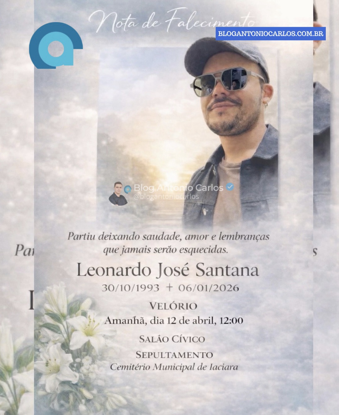 A família de Leonardo José Santana comunica, com profundo pesar, que após meses de espera, o corpo foi liberado da França e retornou ao Brasil, possibilitando a realização de sua despedida junto aos familiares e amigos.