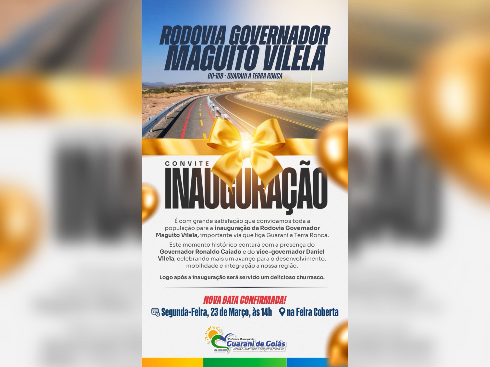 A inauguração da GO-108, da Rodovia Governador Maguito Vilela, que liga o município de Guarani de Goiás ao Parque Estadual de Terra Ronca, já tem nova data definida. O evento será realizado na próxima segunda-feira, dia 23 de março, às 14h, na Feira Coberta da cidade.