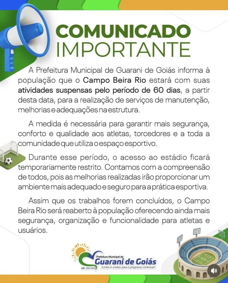 A Prefeitura de Guarani de Goiás informou que o Campo Beira Rio terá as atividades suspensas por um período de 60 dias, a partir desta data. A medida foi anunciada por meio de comunicado oficial divulgado pelo município.