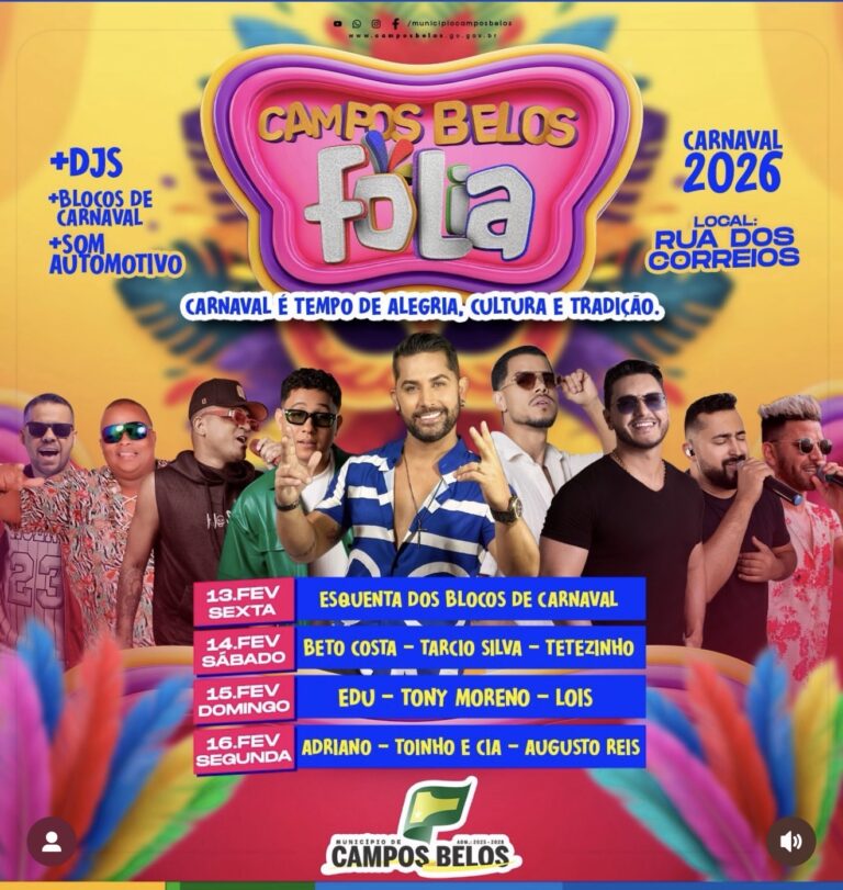 A Prefeitura de Campos Belos (GO) divulgou a programação oficial do Carnaval 2026, que será realizado entre os dias 13 e 16 de fevereiro, na Rua dos Correios. O evento é organizado pela Prefeitura Municipal, em parceria com a Secretaria Municipal de Cultura, e promete quatro dias de muita música, alegria e tradição.