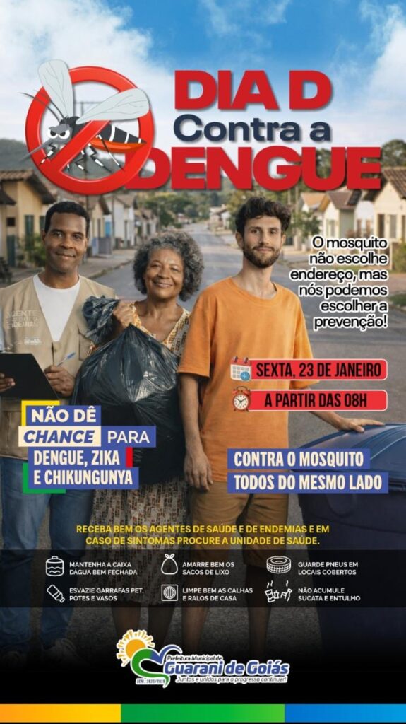 A Prefeitura de Guarani de Goiás promove, nesta sexta-feira, dia 23, o Dia D contra a Dengue, uma grande mobilização voltada à prevenção e ao combate ao mosquito Aedes aegypti, transmissor da dengue, zika e chikungunya. As atividades começam a partir das 8h, com ações concentradas em diversos pontos da cidade.