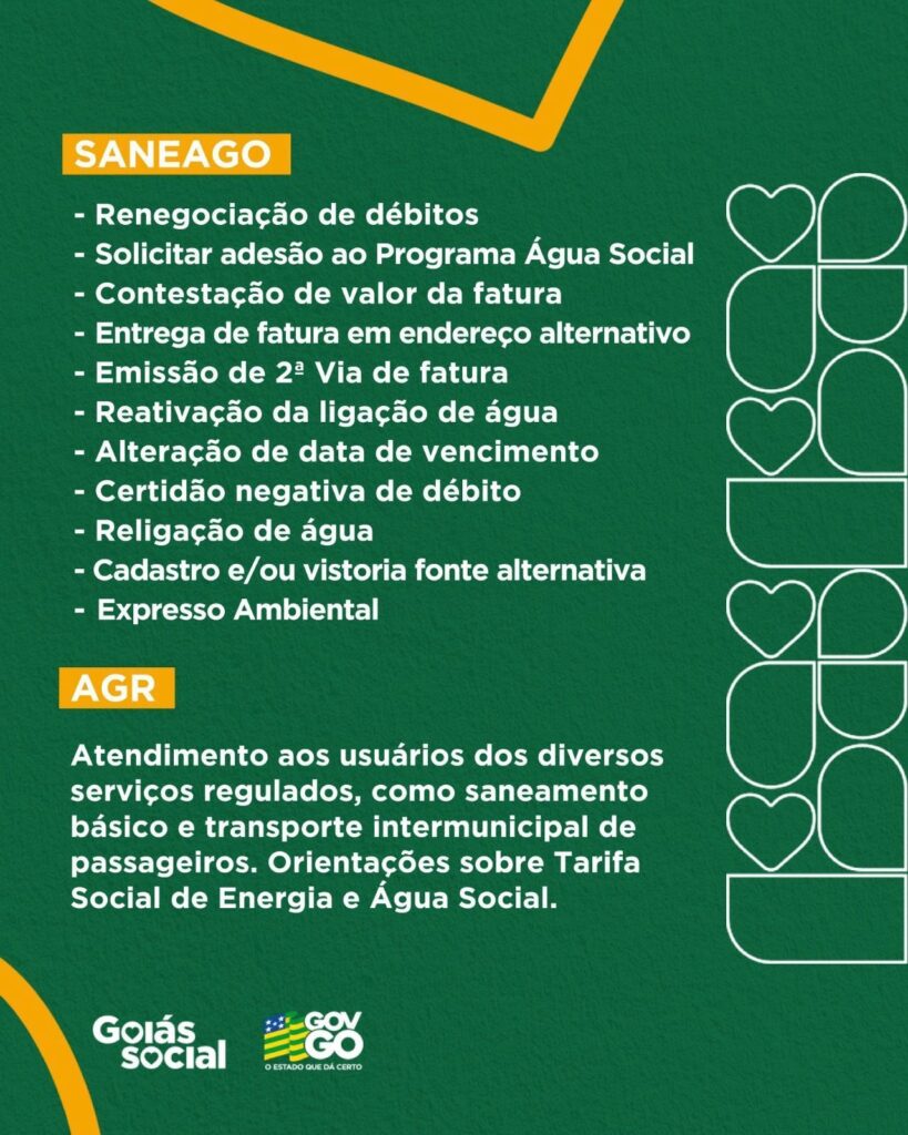 Na área de saneamento, a Saneago oferecerá renegociação de débitos, adesão ao programa Água Social, emissão de segunda via de fatura e outros serviços. Já a AGR prestará orientações sobre transporte intermunicipal e tarifas sociais de água e energia.