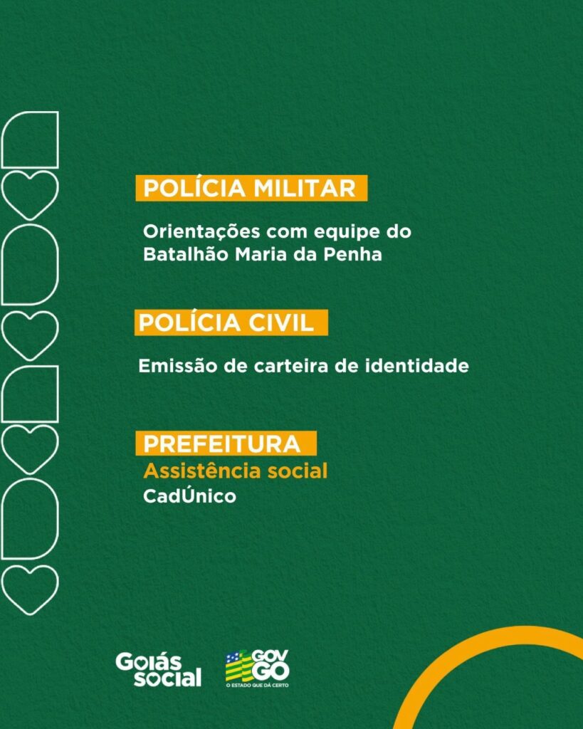 A ação também contará com orientações da Polícia Militar, por meio do Batalhão Maria da Penha, atendimento da Polícia Civil para emissão de carteira de identidade, além de serviços da Prefeitura de Campos Belos, com assistência social e atualização do CadÚnico.