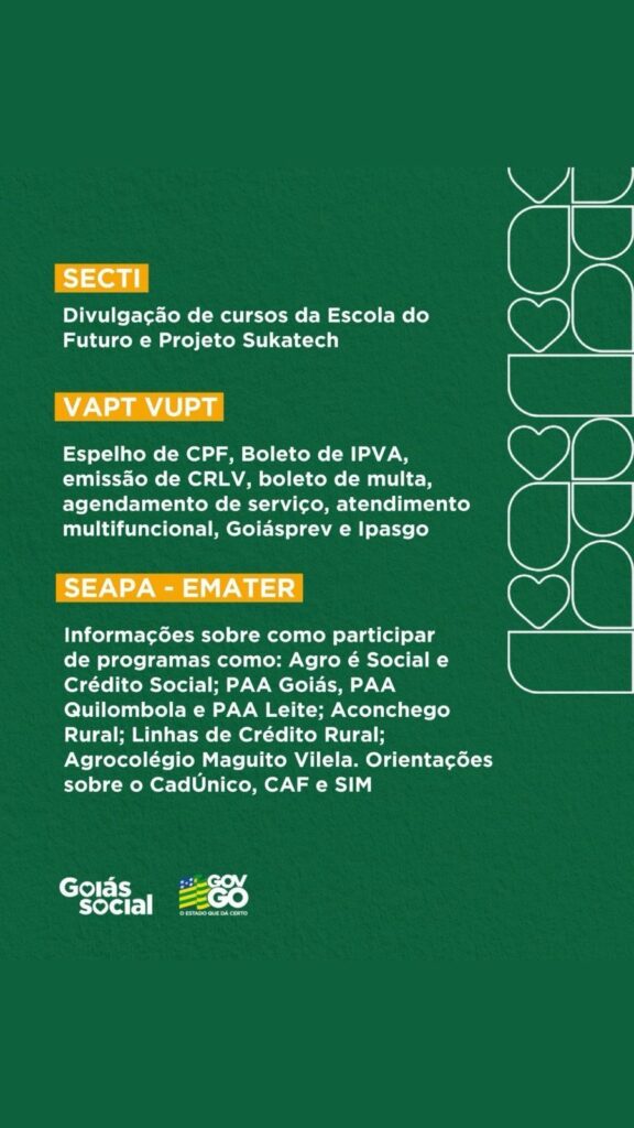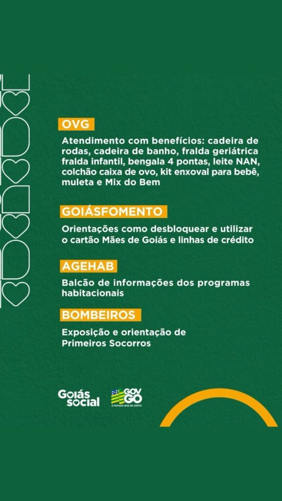 A programação inclui ainda ações de saúde, como vacinação, exames preventivos, aferição de pressão e glicose, atendimentos oftalmológicos, além de atividades de esporte e lazer para crianças. Também participam órgãos como OVG, GoiásFomento, Agehab, Corpo de Bombeiros, Seapa/Emater e demais parceiros estaduais.