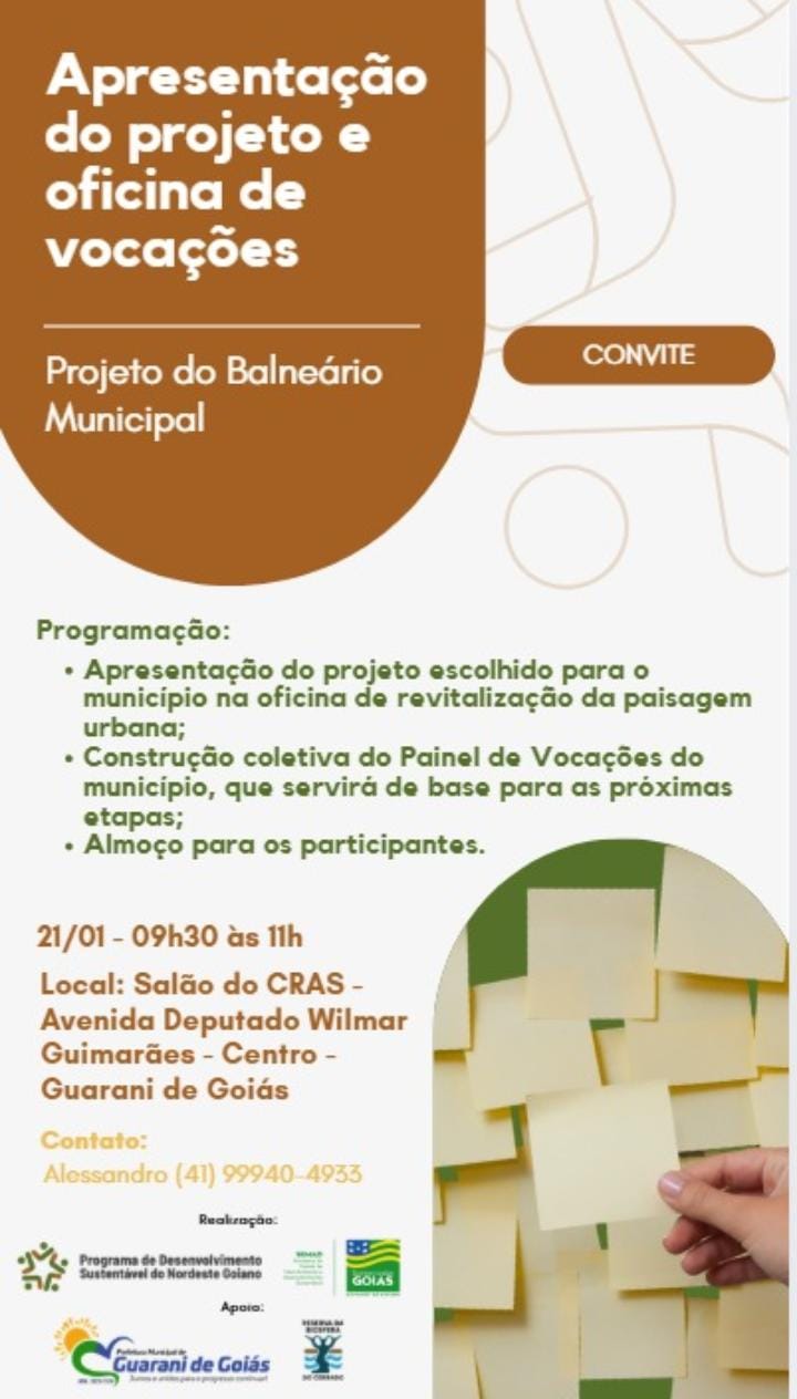 A Prefeitura de Guarani de Goiás realiza, na próxima terça-feira (21), a apresentação do Projeto do Balneário Municipal, acompanhada de uma oficina de vocações voltada à revitalização da paisagem urbana do município.