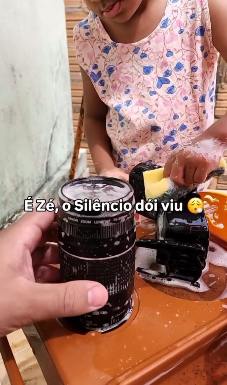Em Campos Belos (GO), o fotógrafo Geisler Ferreira foi surpreendido com uma “ajuda” inesperada e molhada. Sua filha, cheia de boa vontade, resolveu colaborar na limpeza dos equipamentos fotográficos do pai.