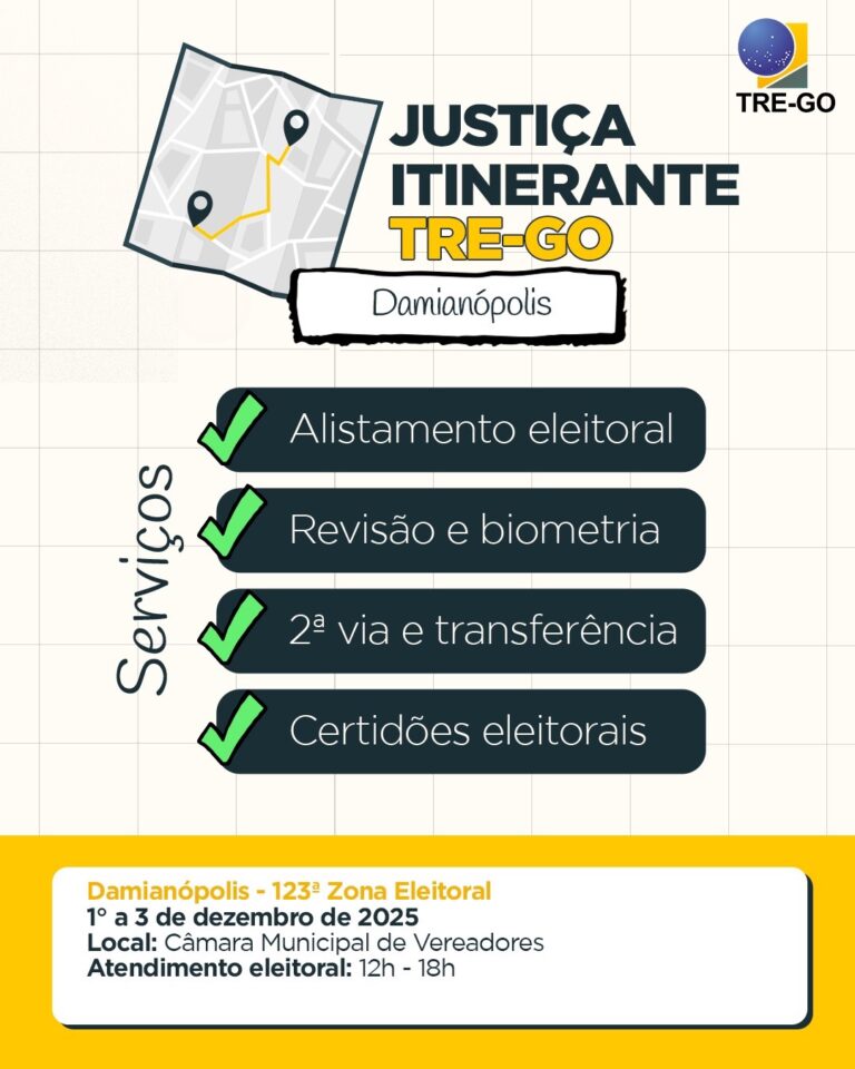 O Tribunal Regional Eleitoral de Goiás (TRE-GO) vai realizar atendimento da Justiça Itinerante nos municípios de Damianópolis e Alvorada do Norte entre os dias 1º e 3 de dezembro de 2025. A iniciativa leva aos eleitores serviços essenciais sem a necessidade de deslocamento até cidades vizinhas.