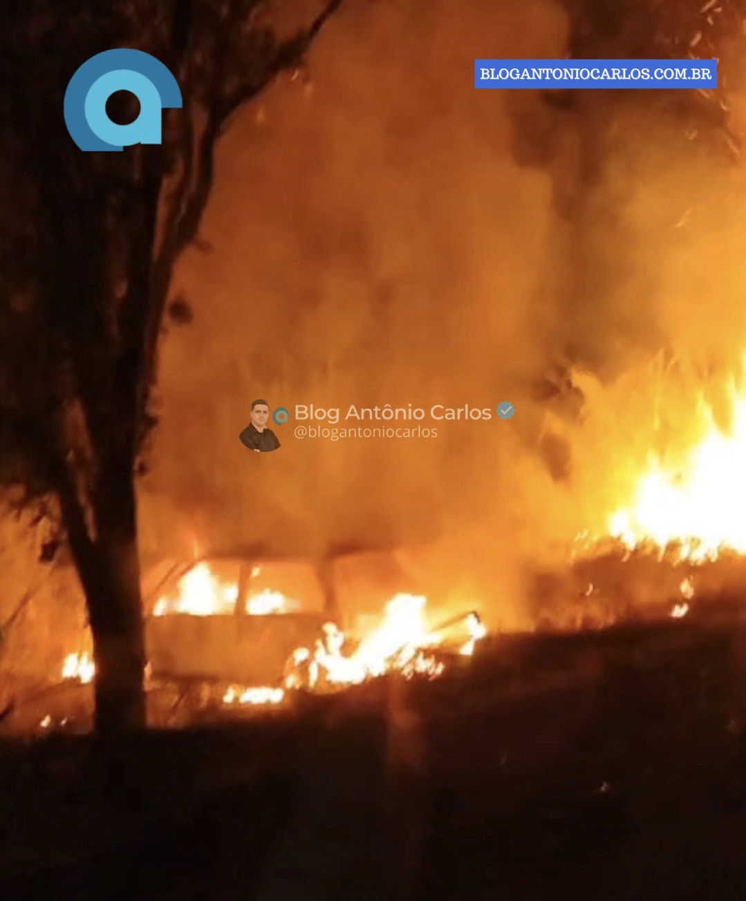 Após o impacto, o carro pegou fogo. O motorista e uma criança que estavam no veículo foram retirados por terceiros antes da chegada das equipes de socorro.