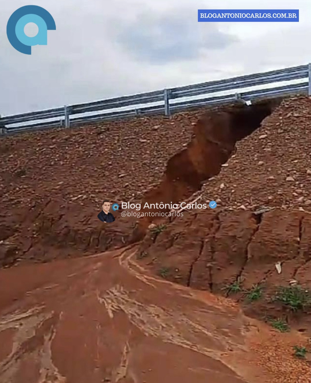 Imagens feitas por moradores no local mostram o processo erosivo já instalado em um talude às margens da pista. Em um dos pontos, a erosão avança em área próxima ao guarda-corpo da rodovia, o que chama a atenção para a necessidade de reparos antes da liberação do tráfego.