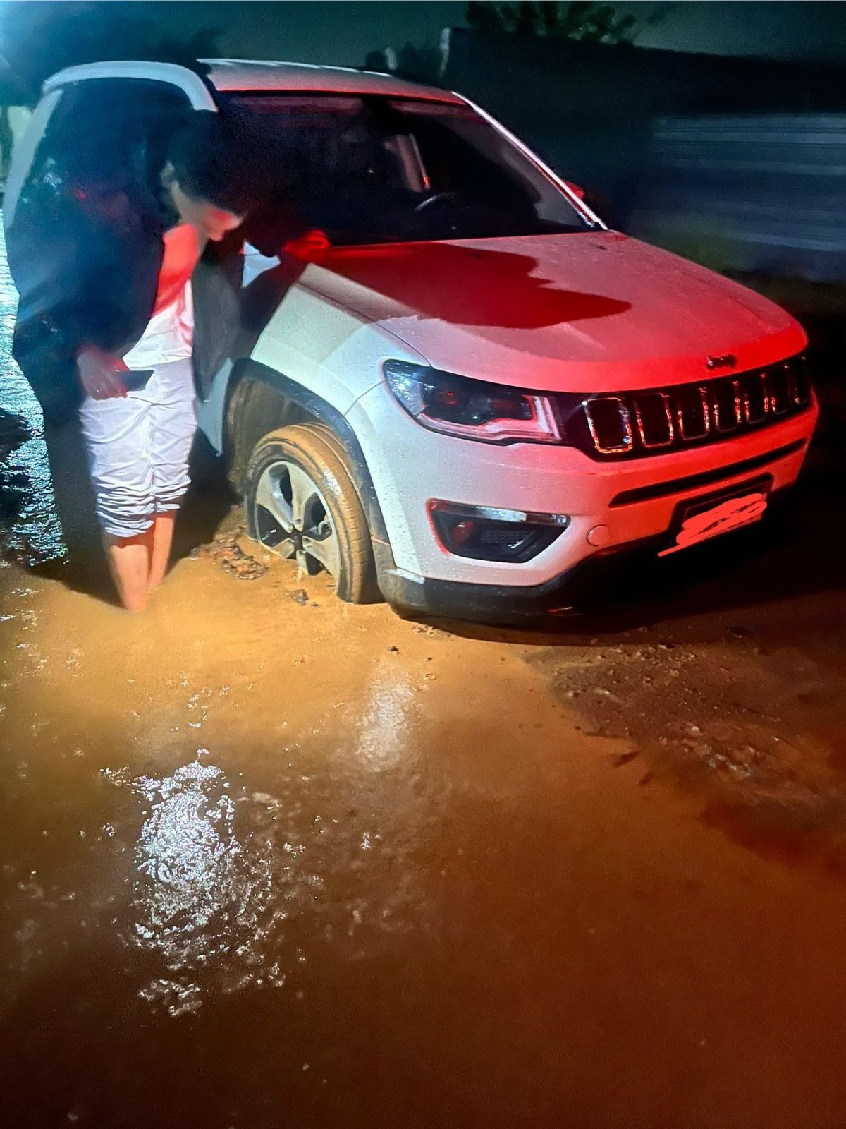 Imagens feitas por moradores mostram o automóvel com parte dos pneus afundados na lama. O condutor precisou descer do veículo para avaliar a situação e tentar encontrar uma forma de retirar o carro do local.
