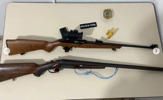 Durante as buscas, foram localizadas duas armas de fogo — uma espingarda calibre 20 e uma espingarda calibre 22 semi-automática — sem o devido registro, além de seis munições e dois carregadores.