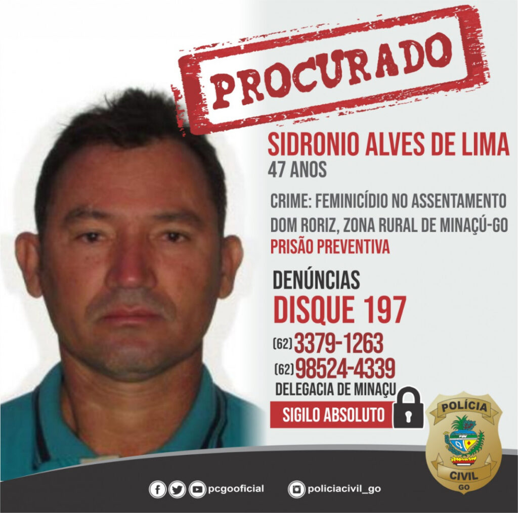 A Polícia Civil de Goiás, por meio da Delegacia de Minaçu, divulgou, nesta quarta-feira (14), o retrato de Sidronio Alves de Lima, 47 anos, suspeito de matar, no último fim de semana, a agricultora Neurice Torres, de 53 anos, no assentamento Dom Roriz, zona rural de Minaçu, região norte de Goiás.