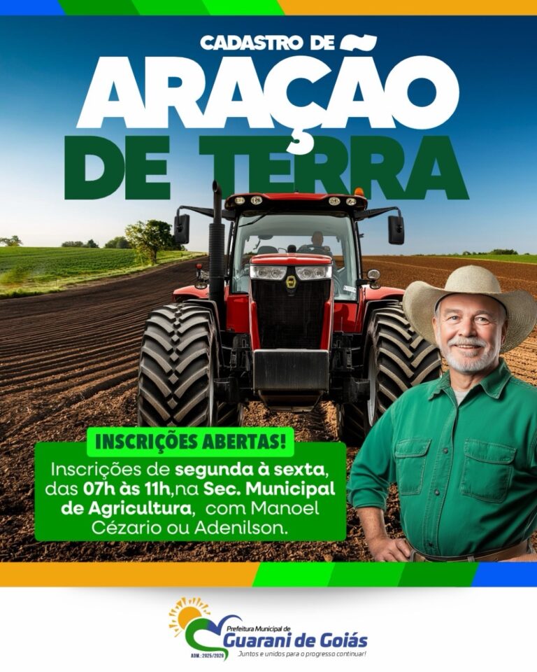 A Prefeitura de Guarani de Goiás, por meio da Secretaria Municipal de Agricultura, deu início ao Cadastro do Produtor Rural para o programa de aração de terras, que tem como objetivo apoiar os agricultores locais no preparo do solo para o novo ciclo produtivo.