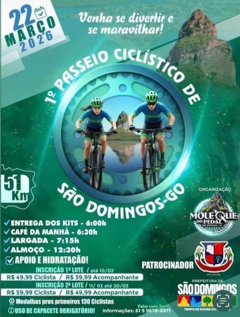 No próximo dia 22 de março de 2026, o município de São Domingos (GO) será palco do 1º Passeio Ciclístico, um evento que une esporte, lazer e turismo, reunindo ciclistas da região em um percurso de 51 quilômetros.